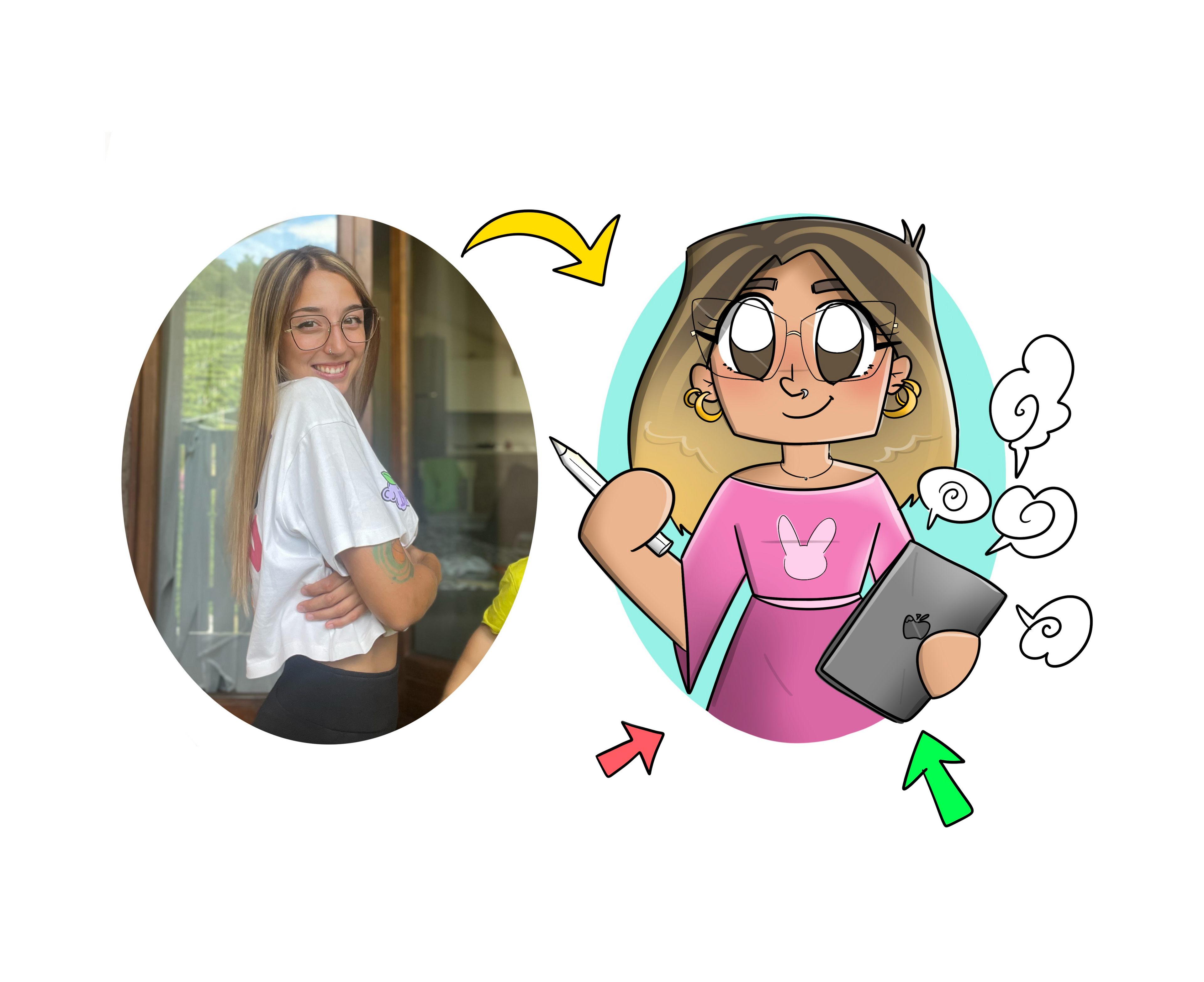 I'm Benedetta , the one with the giant writing above. Yes, I've become a comic, because in my head everything turns into cartoons! 🎨✨I'm 28 years old, I come from Trento , and I've always drawn. Since I was little I colored my favorite Disney characters 🐭🌟, then moving on to art school, where I explored techniques such as painting, mosaic, acrylic and charcoal. But my heart? 💖 It has always remained faithful to cartoon-style portraits .